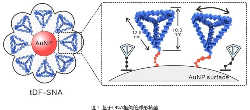 为了提高寡核苷酸的可及性并实现高效的载荷捕获,华东师范大学田阳、刘蒙蒙及上海交通大学樊春海开发了一种基于四面体DNA框架(TDF)的界面工程方法,构建基于DNA框架的球形核酸(TDF-SNA)。具体来讲,受冠状病毒动态、多刺的结构启发,他们通过界面工程将载带SIRNA的TDF通过AU-S键修饰在金纳米颗粒上,使其在核心纳米颗粒表面均匀排列,形成类似冠状病毒表面的具有灵活构象的尖刺结构。