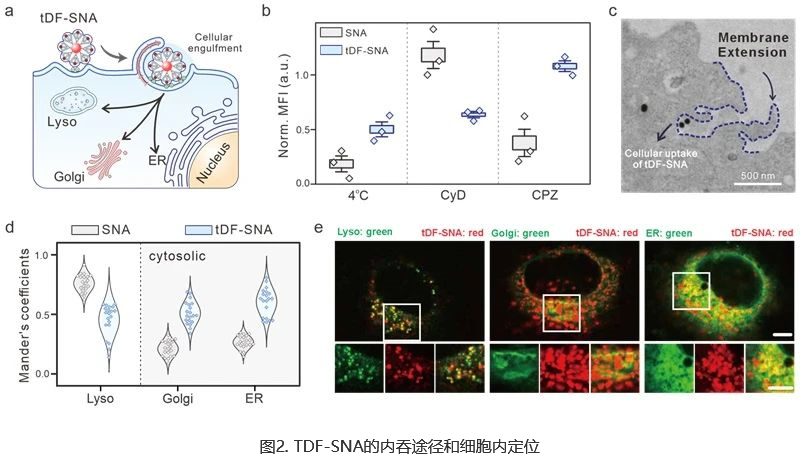 (A) TDF-SNAS内吞示意图。(B) 不同内吞抑制剂和条件下NPS的细胞摄取效率:4℃、网格蛋白介导内吞作用抑制剂(CPZ,氯丙嗪)、吞噬/巨胞饮抑制剂(CYD,细胞松弛素D)。(C) TDF-SNAS内吞的TEM图像。与HELA细胞培养24小时后,TDF-SNAS(红色)与溶酶体、高尔基体和内质网(绿色)等不同细胞器(绿色)的胞内共定位效率(D)和代表性共聚焦图像(E)。