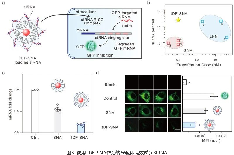 (A) TDF-SNA作为纳米载体递送SIRNA示意图。(B) 常用纳米载体的转染剂量和SIRNA转染数量汇总。(C) 用载带SIRNA的纳米颗粒处理细胞24小时后,GFP-MRNA表达水平的RT-QPCR分析。(D) 载带SIRNA的纳米颗粒与表达GFP的细胞孵育24小时后的共聚焦和流式细胞术分析。